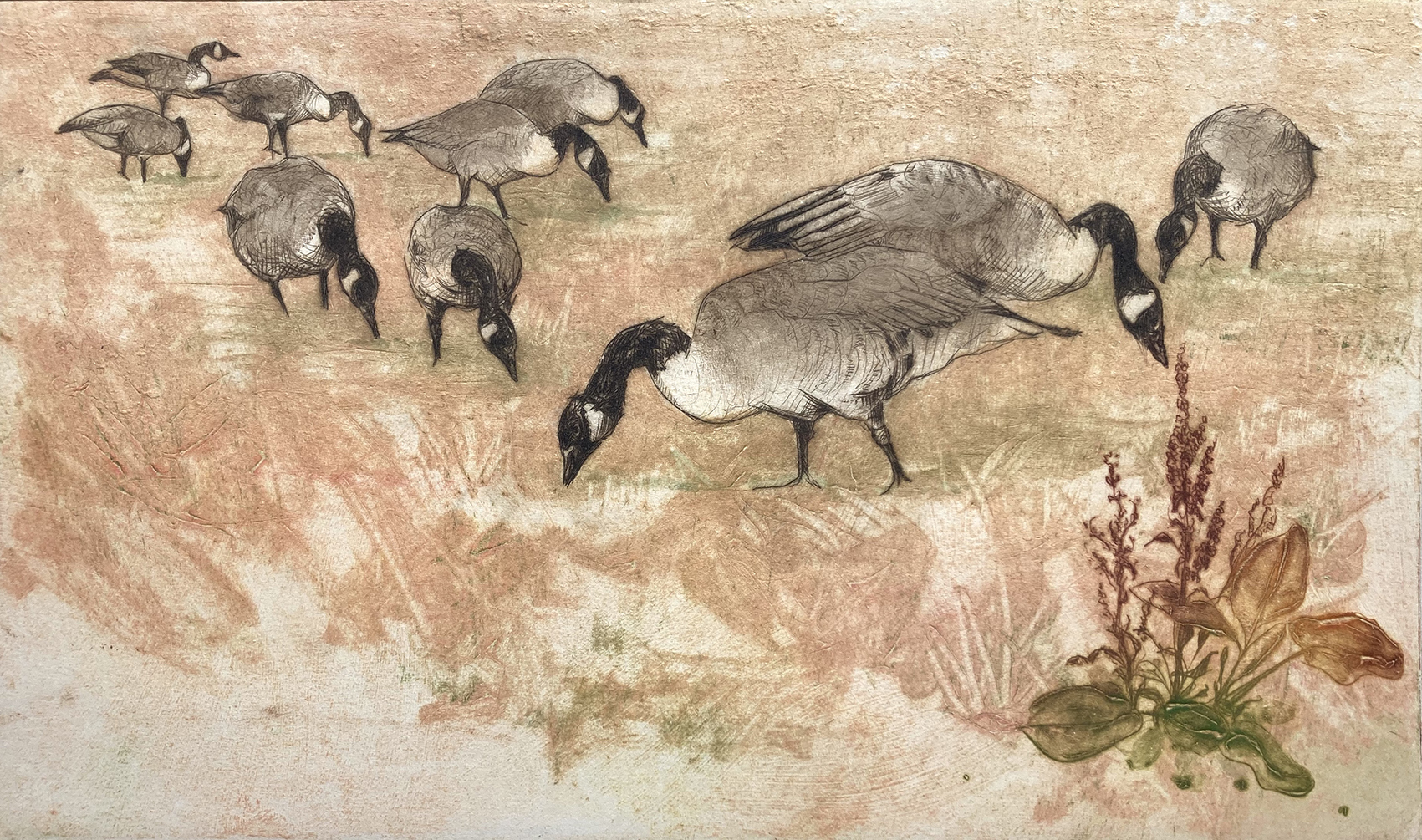 Polly’s aim is to engage the viewer in big conservation issues through simple, joyful imagery. Drawing is at the core, and printmaking is how she brings her artwork to life. Images emerge through the layering of process, where texture and tone tell intricate stories, transporting the viewer to a new place. The line is integral, but the process is all about expression.