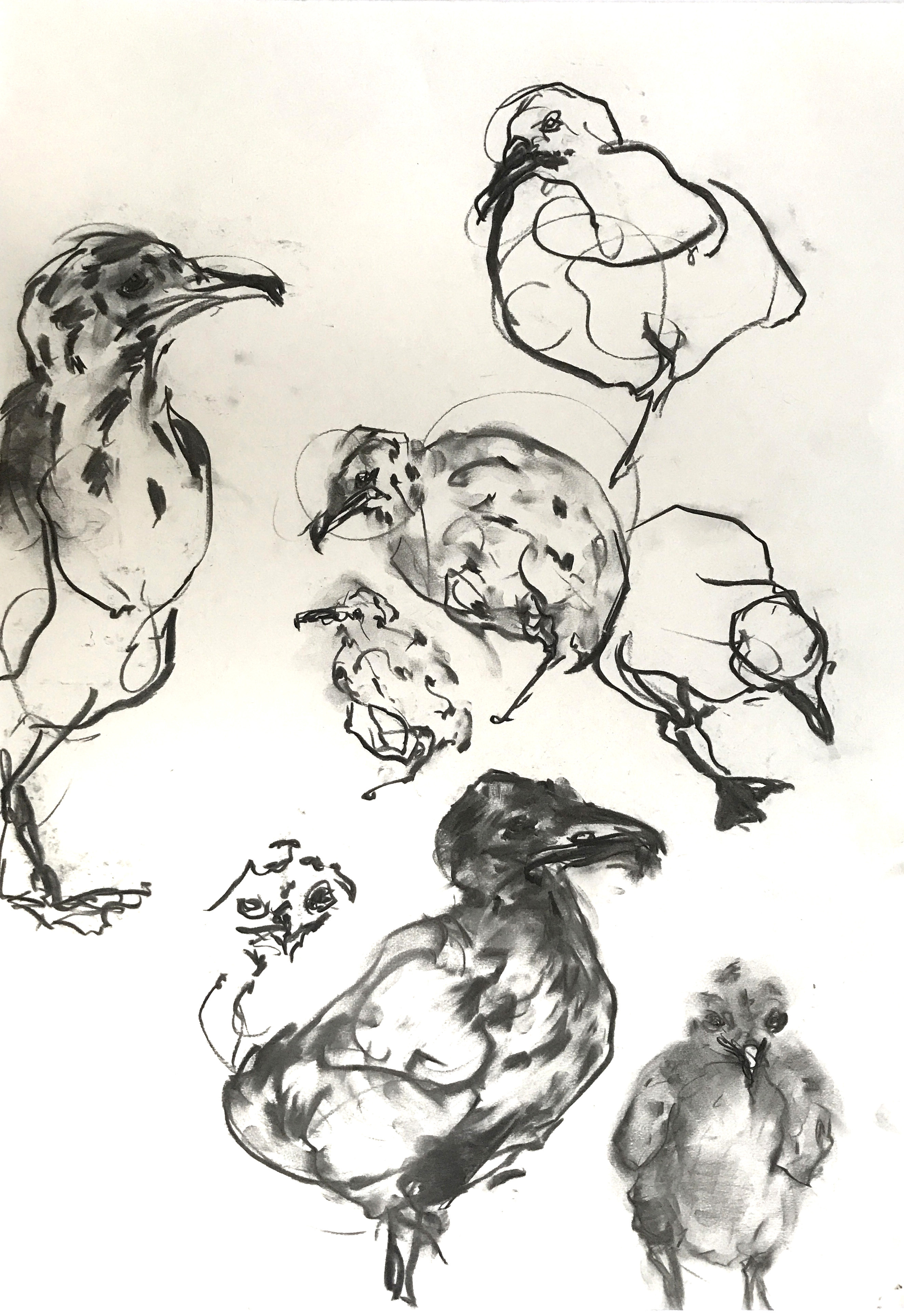 Monday brought a whole new perspective as we had the privileged experience of landing on Fidra. Sailing past the Bass Rock, out of bounds due to avian flu, we all felt moved as we thought of the devastating effect it would have on the seabirds. An effect that we sadly saw more of during the week. On Fidra, we started with a profound warm-up exercise of just listening, without drawing. A perfect fit for the sensory intensity of the island. I considered how I might do justice to the frenetic and dynamic energy of the place. Kittie Jones helpfully suggested trying to work bigger, which freed up the mark-making. Darren Woodhead gave an excellent lecture on anatomy, studying how the wings move in flight especially. Nik’s earlier comment became ever clearer. Truly understanding anatomy leads the way to freedom in artistic expression.